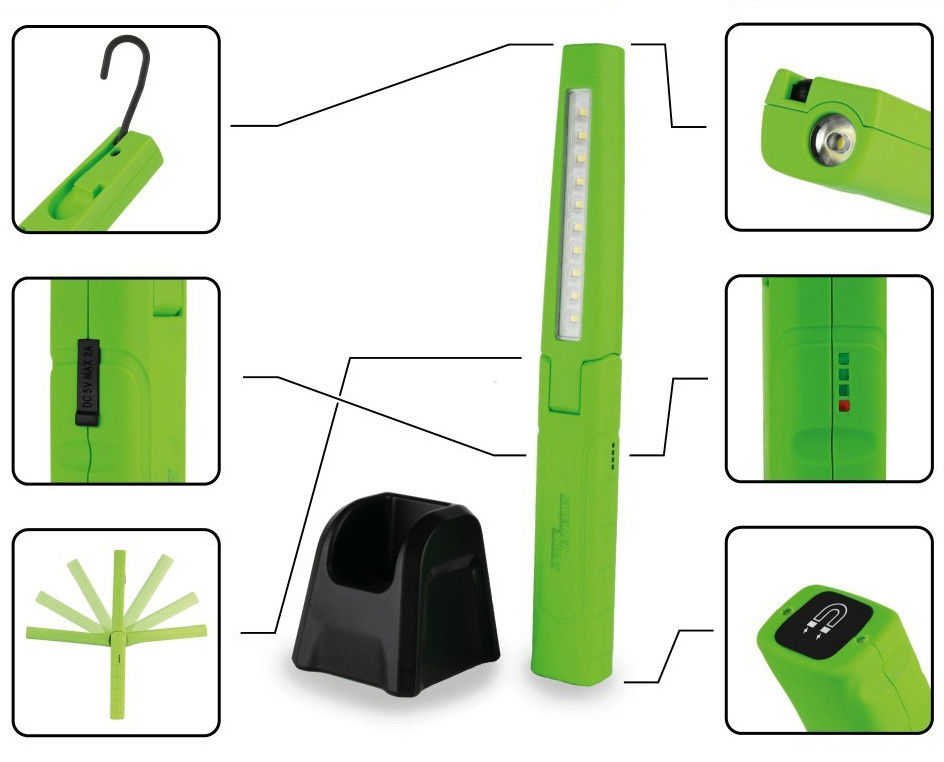 Extra nagy fényerejű (600 lumen) 10+1 LED-del szerelt akkumulátoros profi szerelőlámpa asztali dokkólóval.